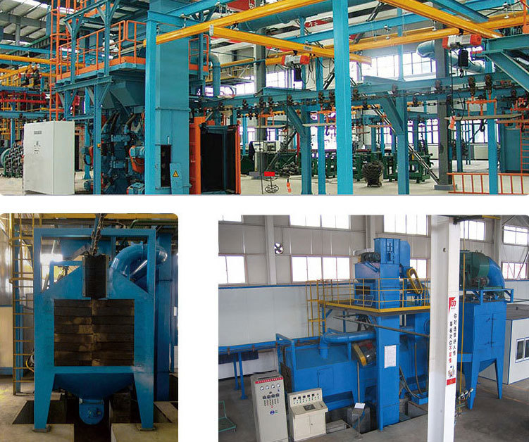 Catenary shot blasting machine is a single stroke catenary continuous shot blasting cleaning equipment, it has static loading and unloading of workpiece, automatic rapid transportation and positioning, workpiece rotation shot blasting cleaning. The machine is controlled by conventional electric appliances and the conveying track of the workpiece is stepless. Suitable for large quantities, cast steel, cast iron, and welding parts of all-round shot blasting cleaning, used for various forms of hanging workpiece. Through shot blasting cleaning, not only can remove the rust on the surface of the workpiece, clean up the weldingslag on the structural parts, but also can eliminate the welding stress of the workpiece, improve the fatigue strength of the workpiece, increase the adhesion of the paint film when the workpiece is painted, and finally achieve the purpose of improving the surface and intemal quality of the whole workpiece. Widely used in metallurgy, petroleum, chemical, machinery and other industries.