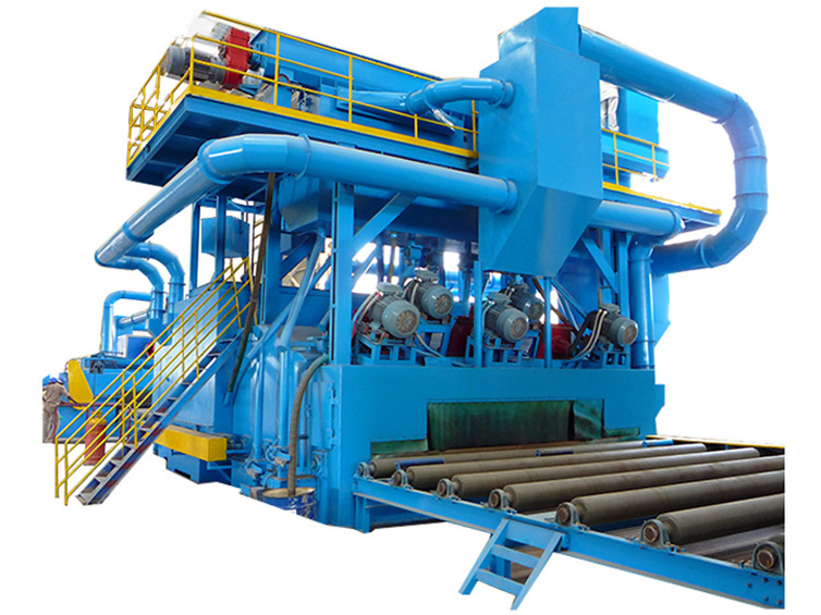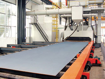 | Steel structure roller conveyor shot blasting machine | The steel structure roller conveyor shot blasting machine is a new type of special shot blasting cleaning equipment designed and manufactured according to user requirements. It is mainly used for cleaning steel structure parts. The workpiece can be cleaned by shot blasting, which can not only remove the rust on the surface of the workpiece, clean the welding slag on the structural parts, but also eliminate the welding stress of the workpiece, improve the fatigue strength of the workpiece, achieve the specified roughness value and hardness, and ultimately achieve the purpose of improving the surface and internal quality of the entire workpiece. | The steel structure roller conveyor shot blasting machine is mainly composed of shot blasting chamber, sealing chamber, purge sealing chamber, roller conveying system, shot blasting machine assembly, separator, elevator, screw conveyor, shot blowing system, shot collecting hopper, dust removal system, electrical system, air control system, etc. | Workpieces to be processed: Length: 12000mm Width: 2400mm Height: 400 mm Workpiece conveying speed: 0.5-4m/min First addition of shot: 8000 kg Shot circulation: 90t/h Equipment power: ~175kW |